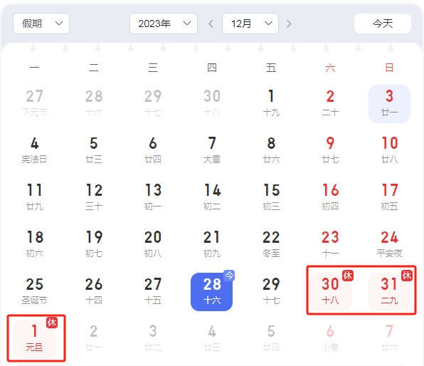 放假時間:2023年12月30日(星期六)至2024年1月1日(星期一),共計3天。