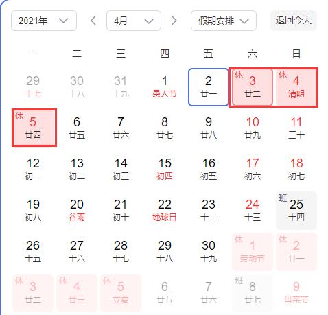 4月3日(星期六)至4月5日(星期一)放假,共3天。4月6日(星期二)上班。